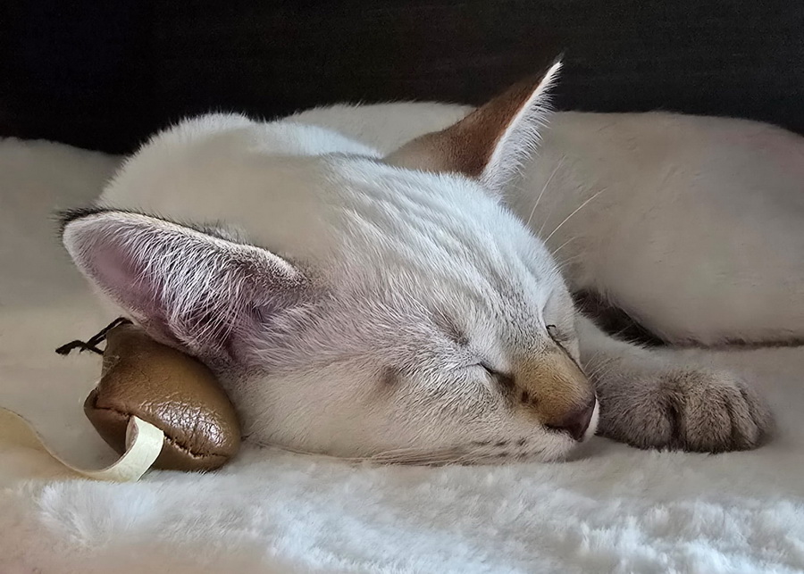 Der Mädelsversteher. Ein liebenswürdiger schlauer Charmeur, der als erstes verstanden hat, wozu ein Katzenklo da ist. Seine „Beute“ (Wedel, Spirale…) verteidigt er lautstark.