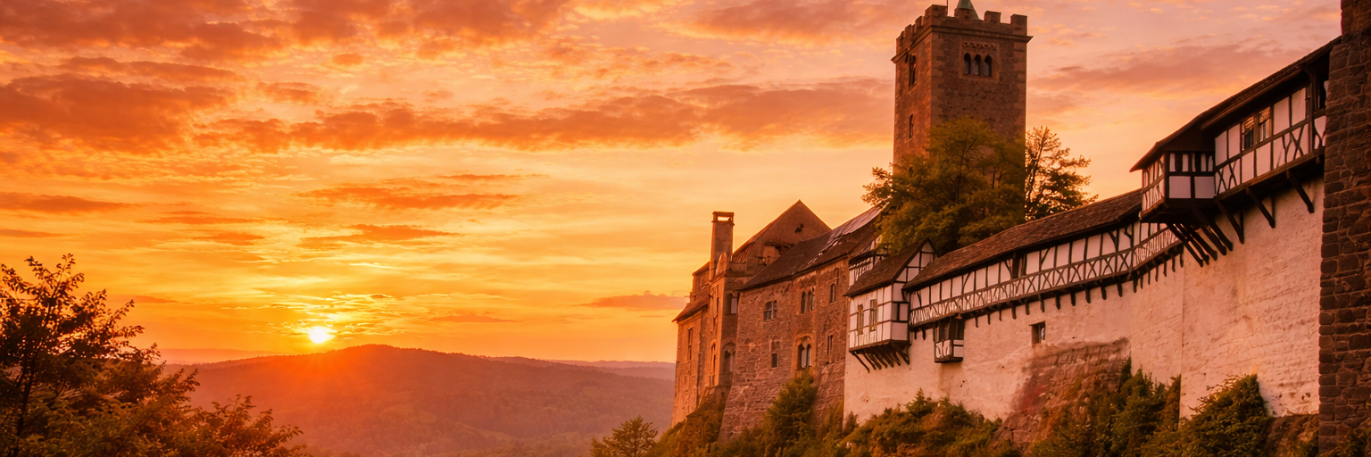 Die Wartburg fügt sich harmonisch in ihre waldreiche Umgebung ein und ist in vielerlei Hinsicht eine ideale Burg. Obwohl einige Originalteile aus der Feudalzeit erhalten sind, vermittelt die im 19. Jahrhundert wiederaufgebaute Form eine gute Vorstellung davon, wie diese Festung auf dem Höhepunkt ihrer militärischen und herrschaftlichen Macht ausgesehen haben könnte. Während seines Exils auf der Wartburg übersetzte Martin Luther das Neue Testament ins Deutsche.